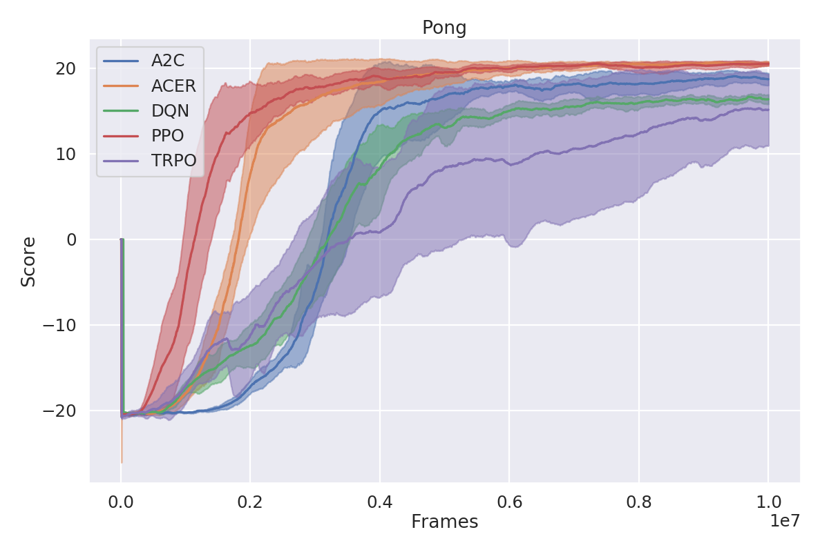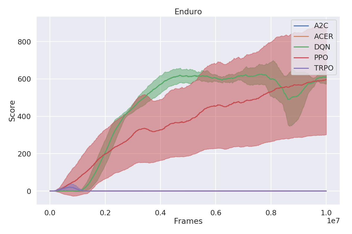 - OpenAI baselines TRPO implementation has had a particularly poor parametrization chosen for the Atari environments. I've decided to use a parametrization closer to what other algorithms use. Because of that my results for TRPO on Atari are generally better. Enduro seems to be an outlier there, but I was not able to replicate the score they've reported while running their code locally. It may be possible they've gotten one lucky seed out of six runs, what that gave them 37 points on average in benchmark.